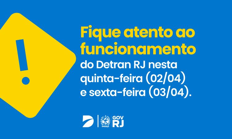 O Detran RJ informa que, devido ao feriado da Sexta-Feira Santa (3/4) e ao ponto facultativo decretado pelo Governo do Estado nesta quinta-feira (2/4), as unidades de atendimento do departamento...